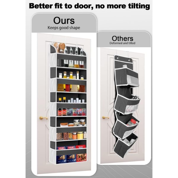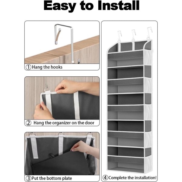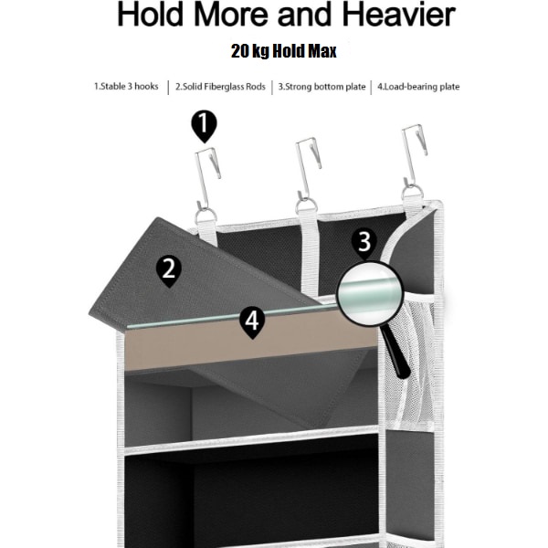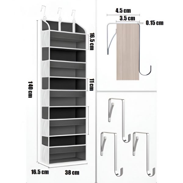 Wyposażony w 3 regulowane metalowe haczyki, ten organizer łatwo pasuje do drzwi o grubości do 4 cm.