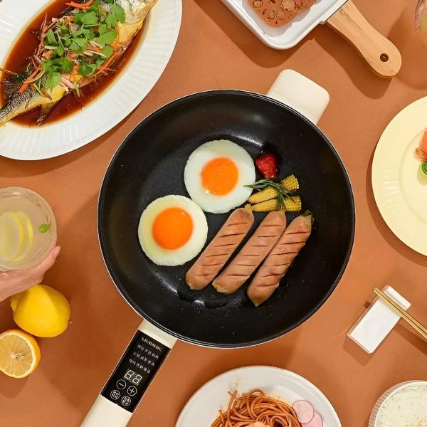 Ta elektryczna patelnia umożliwia przygotowywanie pełnych posiłków bez konieczności używania kuchenki, dzięki czemu idealnie nadaje się do każdej przestrzeni.