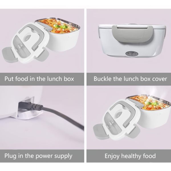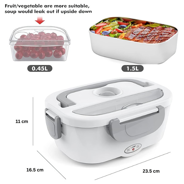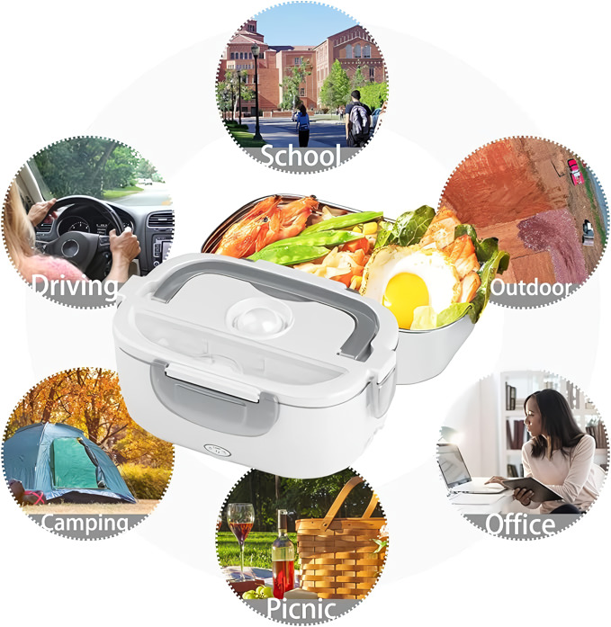 Dwie wyjmowane komory z PP oddzielają danie główne od przystawki – a obie można potem umyć w zmywarce. Działa w biurze, w samochodzie, na budowie lub w każdym pomieszczeniu z gniazdkiem elektrycznym.