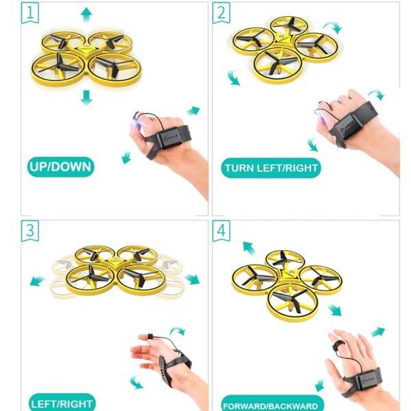 2. Obrót: Należy nacisnąć przycisk na palcu. Dron będzie się obracał zgodnie z obrotem ręki.